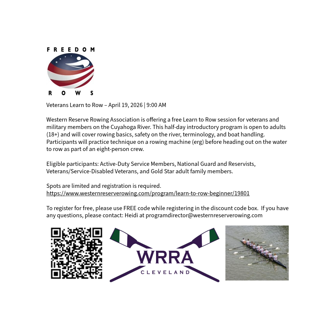 Western Reserve Rowing Association (WRRA) is proud to offer Freedom Rows, a program designed specifically for Veterans and family members of Veterans in the Greater Cleveland area.