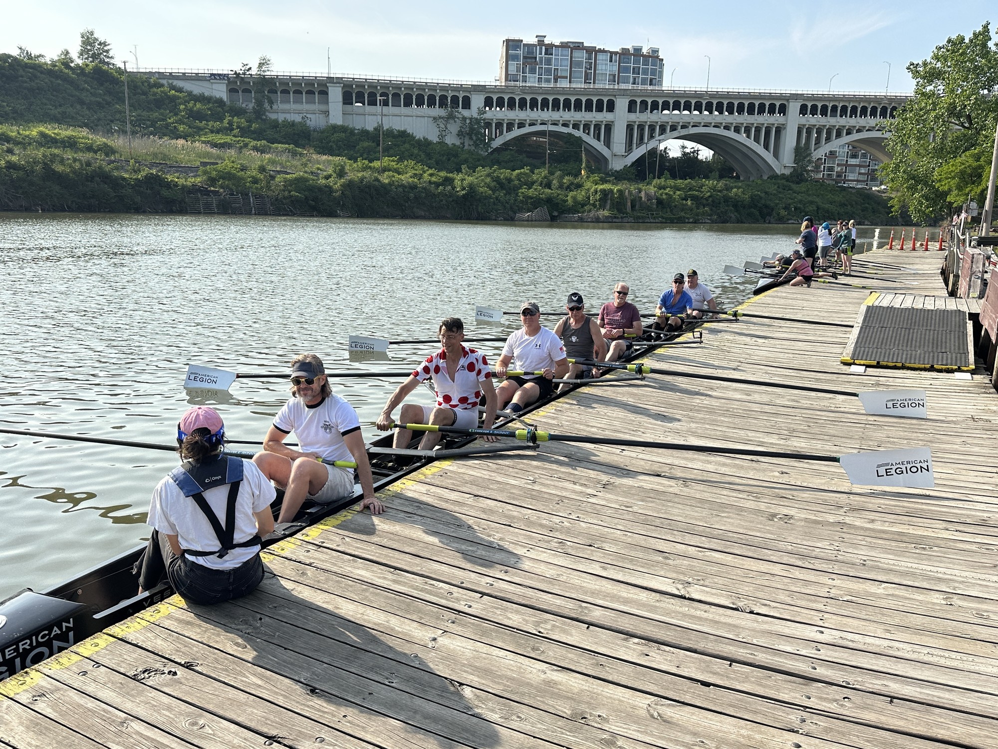 The program is designed for rowers of all abilities and skill levels, from beginners to seasoned veterans, to row together as a team in an eight-person shell. Teams prepare for racing in a mid-season and end-of-season regatta on the Cuyahoga River.